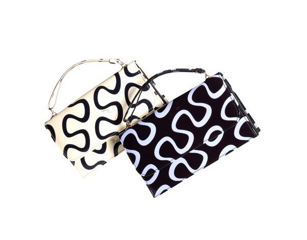 Emilio Pucci представляет кожаную сумку в двух цветовых сочетаниях — черный с сиреневым и черный с цветом слоновой кости — в которой использован мотив легендарного принта «Onda» из знаменитой коллекции Palio 1957 г.