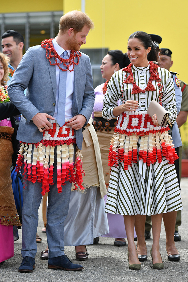 Меган Маркл в платье Veronica Beard и туфлях Aquazzura и принц Гарри в Тонга