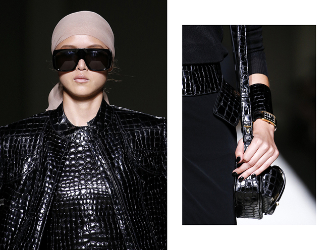 Косынки и очень много лакированной кожи в коллекции Тома Форда